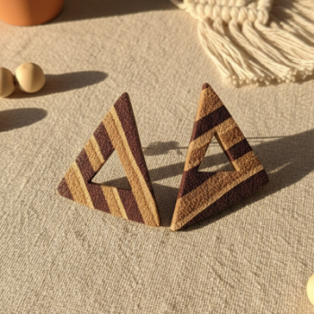 Μοντέρνα σκουλαρίκια σε γεωμετρικό σχήμα, κοίλο τρίγωνο (κρίκος). Διαθέτουν ριγέ μοτίβο σε ζεστές αποχρώσεις του καφέ (σκούρο σοκολατί, μεσαίο καφέ, μπεζ) που θυμίζει ξύλο.