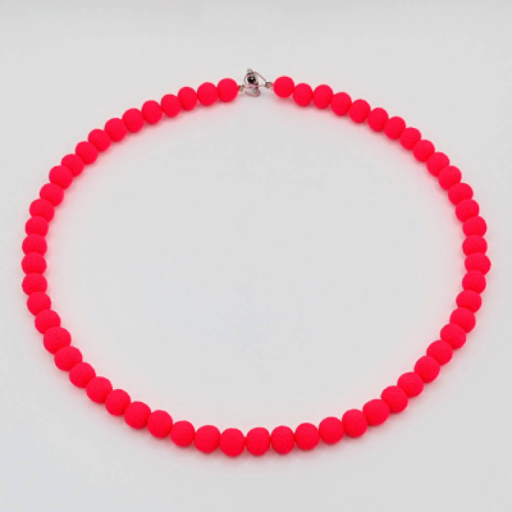 Ενιαία Παράγραφος): Αυτό το τολμηρό χειροποίητο κολιέ είναι κατασκευασμένο εξ ολοκλήρου από στρογγυλές χάντρες από πολυμερή πηλό . Το έντονο φούξια χρώμα και η ανάγλυφη, ματ υφή (lava effect ή σαγρέ) των χαντρών του προσδίδουν έναν σύγχρονο και φωτεινό χαρακτήρα. Όλες οι χάντρες είναι ιδίου, μικρού μεγέθους, δημιουργώντας ένα ομοιόμορφο μονόχρωμο Statement αποτέλεσμα. Το κολιέ ολοκληρώνεται με ένα διακριτικό κούμπωμα σε ασημί τόνο. Υλικό: Χάντρες/ Πολυμερής Πηλός Χρώμα: Φούξια (Monochromatic) Σχήμα: Στρογγυλές Χάντρες (Ομοιόμορφο Μέγεθος) Κούμπωμα: Ασημί Στυλ: Statement / Minimal / Lava Μήκος:36cm