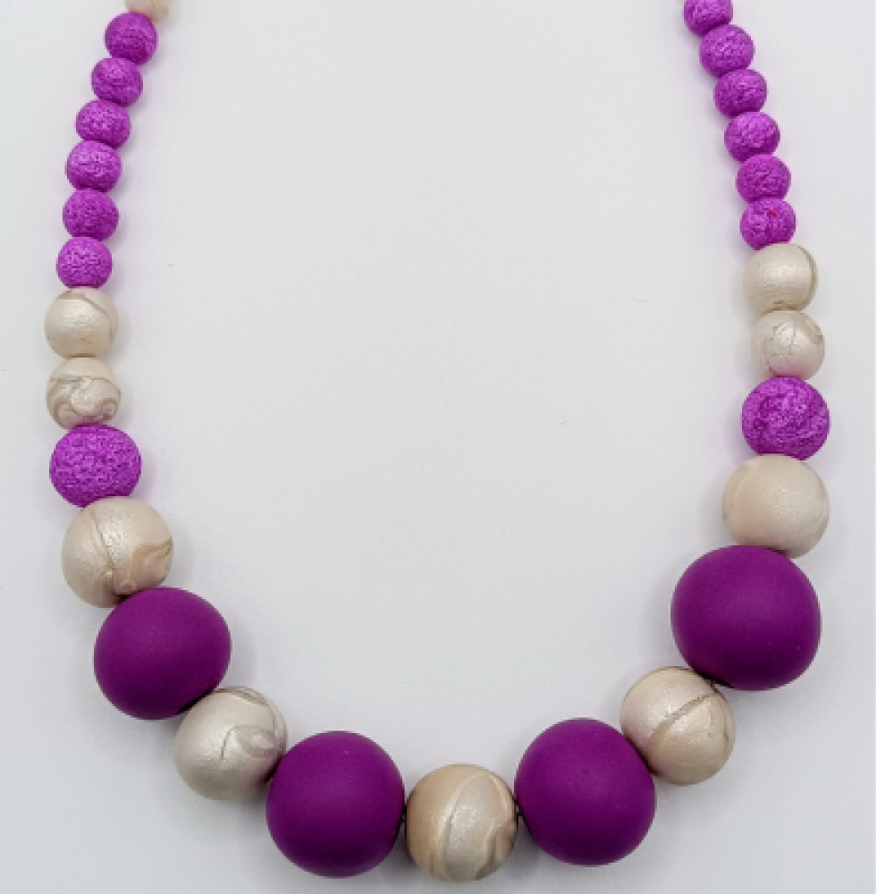 Αυτό το εντυπωσιακό χειροποίητο κολιέ είναι σχεδιασμένο σε κλιμακωτό μήκος (Collar/Princess) και ξεχωρίζει για την έντονη αντίθεση μεγεθών, υφών και χρωμάτων (Mixed Media). Η σύνθεσή του βασίζεται στην εναλλαγή δύο τύπων χαντρών από πολυμερή πηλό : έντονες μωβ/φούξια χάντρες που έχουν ανάγλυφη, ματ υφή (lava effect) και περλέ ασημί/nude χάντρες με απαλή λάμψη. Οι χάντρες μικραίνουν σταδιακά προς το πίσω μέρος, δίνοντας μια κομψή καμπύλη στο ντεκολτέ. Ο συνδυασμός του τολμηρού μωβ με το διακριτικό περλέ το καθιστά ένα ευέλικτο Statement κομμάτι, κατάλληλο τόσο για casual όσο και για πιο επίσημες εμφανίσεις. Το κολιέ ολοκληρώνεται με ένα διακριτικό κούμπωμα σε ασημί τόνο. Υλικό: Χάντρες/ Πολυμερής Πηλός Χρώμα: Μωβ/Φούξια & Περλέ Ασημί/Nude Σχήμα: Στρογγυλές Χάντρες (Κλιμακωτό Μέγεθος) Κούμπωμα: Ασημί Στυλ: Statement / Mixed Media / Graduated Μήκος:38cm