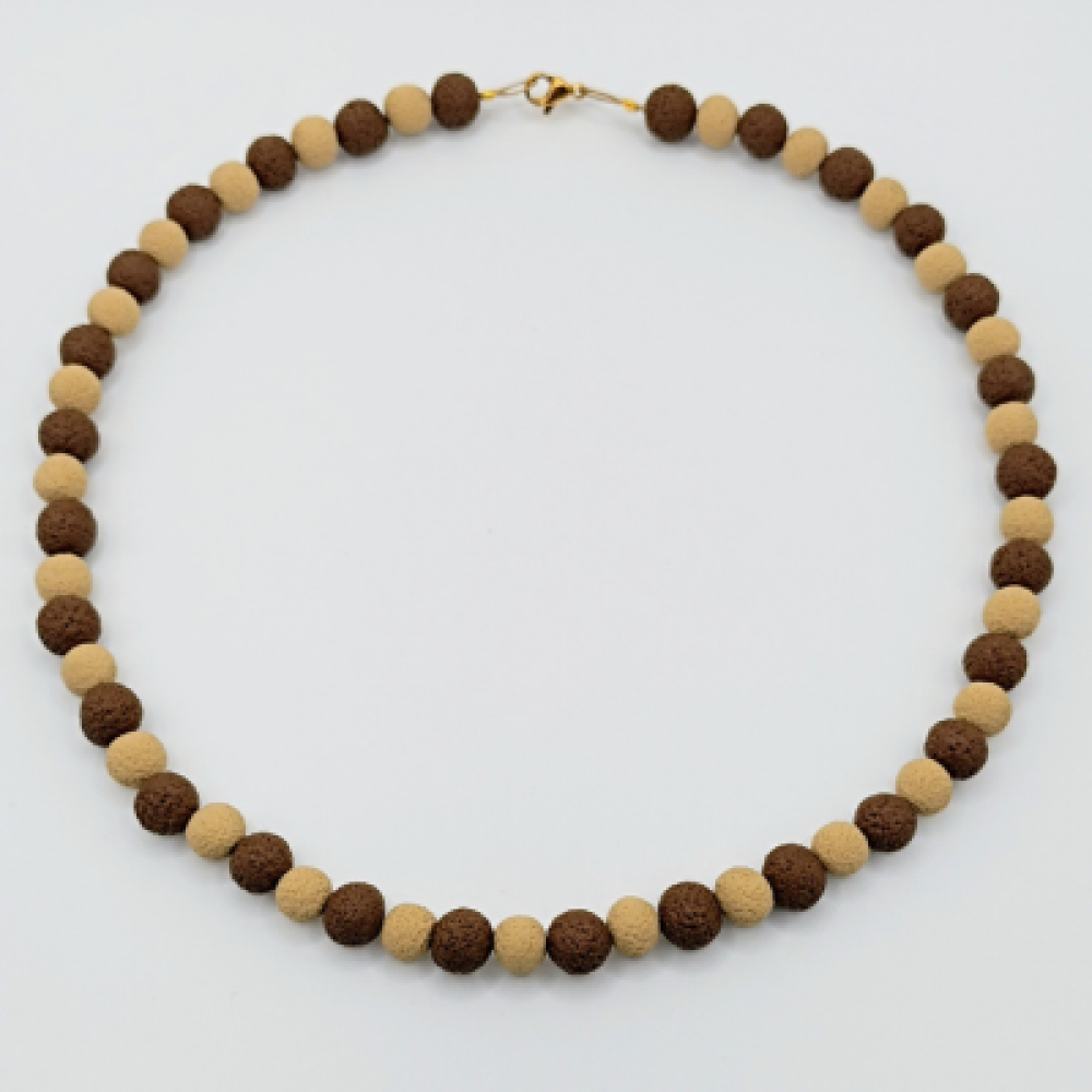 Ενιαία Παράγραφος): Αυτό το κομψό χειροποίητο κολιέ είναι κατασκευασμένο με στρογγυλές χάντρες από πολυμερή πηλό που εναλλάσσονται αρμονικά στα χρώματα καφέ και μπεζ. Όλες οι χάντρες φέρουν την ίδια ματ και ανάγλυφη υφή (lava effect ή σαγρέ), ενισχύοντας τη Statement εμφάνισή του. Οι χάντρες είναι ολόιδιες (μη κλιμακωτές), δημιουργώντας ένα ομοιόμορφο αποτέλεσμα γύρω από το λαιμό. Ολοκληρώνεται με ένα διακριτικό κούμπωμα σε χρυσαφί τόνο. Υλικό: Χάντρες/ Πολυμερής Πηλός Χρώμα: Καφέ & Μπεζ (Bicolor) Σχήμα: Στρογγυλές Χάντρες με Ανάγλυφη Υφή (Ομοιόμορφο Μέγεθος) Κούμπωμα: Χρυσαφί Στυλ: Statement / Bicolor / Lava Μήκος:36cm
