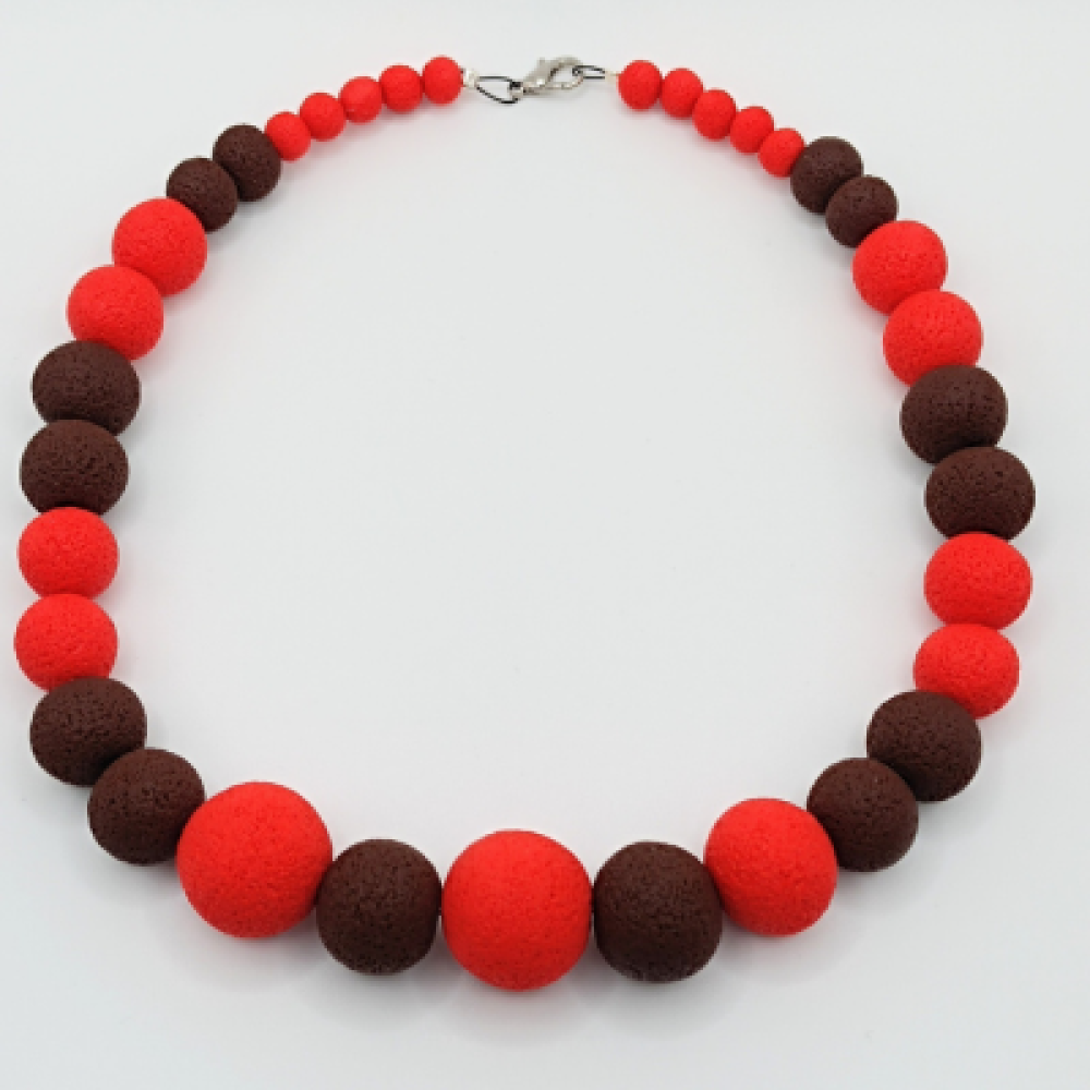 Αυτό το τολμηρό χειροποίητο κολιέ είναι κατασκευασμένο με στρογγυλές χάντρες από πολυμερή πηλό που εναλλάσσονται στα χρώματα έντονο κόκκινο και σκούρο καφέ. Όλες οι χάντρες έχουν την ίδια ματ και ανάγλυφη υφή (lava effect ή σαγρέ). Οι χάντρες κλιμακώνονται σε μέγεθος, με τις μεγαλύτερες να βρίσκονται στο κέντρο, δημιουργώντας ένα εντυπωσιακό οπτικό αποτέλεσμα. Η διχρωμία του το κάνει ιδανικό για να προσθέσει ένταση σε κάθε εμφάνιση. Το κολιέ ολοκληρώνεται με ένα διακριτικό κούμπωμα σε ασημί τόνο. Υλικό: Χάντρες/ Πολυμερής Πηλός Χρώμα: Κόκκινο & Καφέ (Bicolor) Σχήμα: Στρογγυλές Χάντρες (Κλιμακωτό Μέγεθος) Υφή: Lava Effect (Ανάγλυφη, Ματ) Κούμπωμα: Ασημί Στυλ: Statement / Graduated / Lava Μήκος:36cm