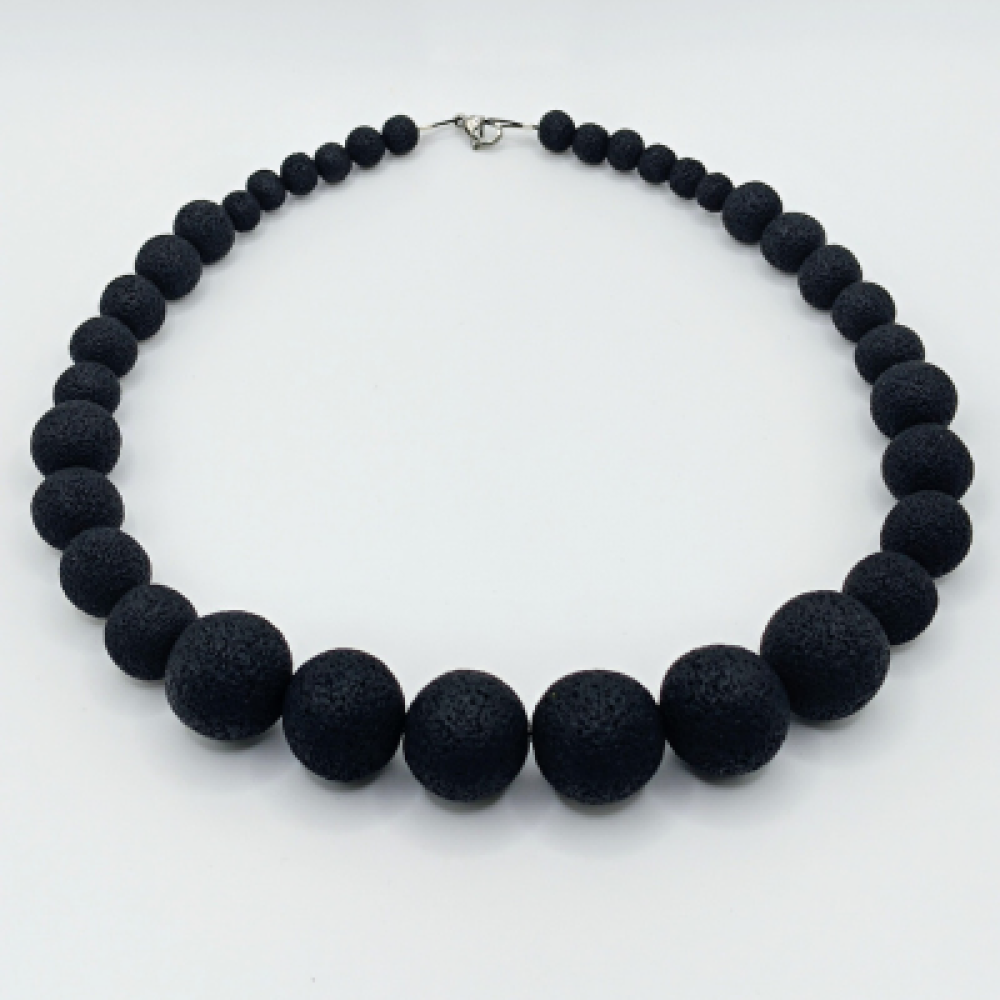 : Αυτό το δυναμικό χειροποίητο κολιέ είναι κατασκευασμένο εξ ολοκλήρου από στρογγυλές χάντρες από πολυμερή πηλό . Το κλασικό μαύρο χρώμα και η ανάγλυφη, ματ υφή (lava effect ή σαγρέ) των χαντρών του προσδίδουν έναν σύγχρονο και κομψό χαρακτήρα. Οι χάντρες κλιμακώνονται σε μέγεθος, με τις μεγαλύτερες να βρίσκονται στο κέντρο και να μικραίνουν σταδιακά, δημιουργώντας ένα εντυπωσιακό οπτικό αποτέλεσμα. Η μονόχρωμη σύνθεσή του το καθιστά ένα ευκολοφόρετο κομμάτι, ιδανικό για layering. Το κολιέ ολοκληρώνεται με ένα διακριτικό κούμπωμα σε ασημί τόνο. Υλικό: Χάντρες/ Πολυμερής Πηλός Χρώμα: Μαύρο (Monochromatic) Σχήμα: Στρογγυλές Χάντρες (Κλιμακωτό Μέγεθος) Κούμπωμα: Ασημί Στυλ: Statement / Graduated / Lava Μήκος:36cm