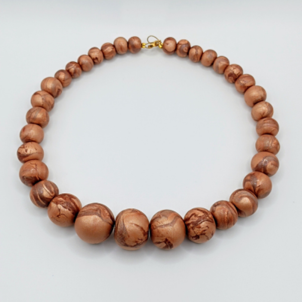 Ενιαία Παράγραφος): Αυτό το κομψό χειροποίητο κολιέ είναι κατασκευασμένο από στρογγυλές χάντρες από πολυμερή πηλό . Η ιδιαίτερη τεχνική του προσδίδει ένα φυσικό μοτίβο που μιμείται την υφή του μαρμάρου ή του ξύλου (marble/wood effect), ενώ η μπρονζέ/χάλκινη απόχρωση του δίνει μια ζεστή, μεταλλική λάμψη. Οι χάντρες κλιμακώνονται σε μέγεθος, με τις μεγαλύτερες να βρίσκονται στο κέντρο και να μικραίνουν σταδιακά. Το κολιέ ολοκληρώνεται με ένα διακριτικό κούμπωμα σε χρυσαφί τόνο. Υλικό: Χάντρες/ Πολυμερής Πηλός Χρώμα: Μπρονζέ/Χάλκινο (Bronze/Copper) Σχήμα: Στρογγυλές Χάντρες (Κλιμακωτό Μέγεθος) Κούμπωμα: Χρυσαφί Στυλ: Statement / Graduated / Marble Effect Μήκος:36cm