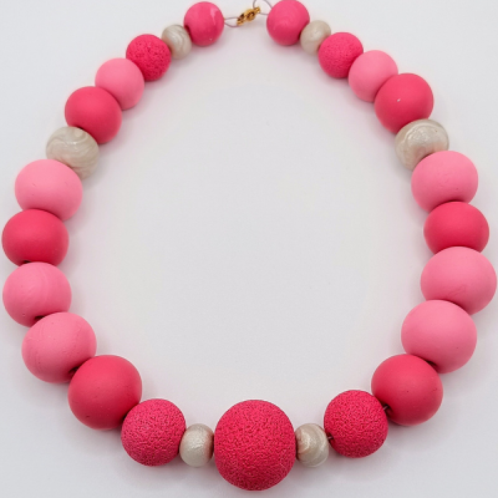 Αυτό το δυναμικό χειροποίητο κολιέ ξεχωρίζει για την ισορροπία των θηλυκών τόνων του ροζ/φούξια με το περλέ ασημί. Η σύνθεσή του βασίζεται στην εναλλαγή τριών τύπων στρογγυλών χαντρών από πολυμερή πηλό : έντονες φούξια χάντρες με ανάγλυφη υφή (lava effect), πιο απαλές ροζ χάντρες με ματ υφή, και περλέ ασημί/λευκές χάντρες με απαλή λάμψη. Οι χάντρες κλιμακώνονται σε μέγεθος, με τη μεγαλύτερη χάντρα να βρίσκεται στο κέντρο και να μικραίνουν σταδιακά. Το κολιέ ολοκληρώνεται με ένα διακριτικό κούμπωμα σε χρυσαφί τόνο. Υλικό: Χάντρες/ Πολυμερής Πηλός Χρώμα: Ροζ, Φούξια & Περλέ Ασημί/Λευκό Σχήμα: Στρογγυλές Χάντρες (Κλιμακωτό Μέγεθος) Κούμπωμα: Χρυσαφί Στυλ: Statement / Graduated / Mixed Media Μήκος:36cm