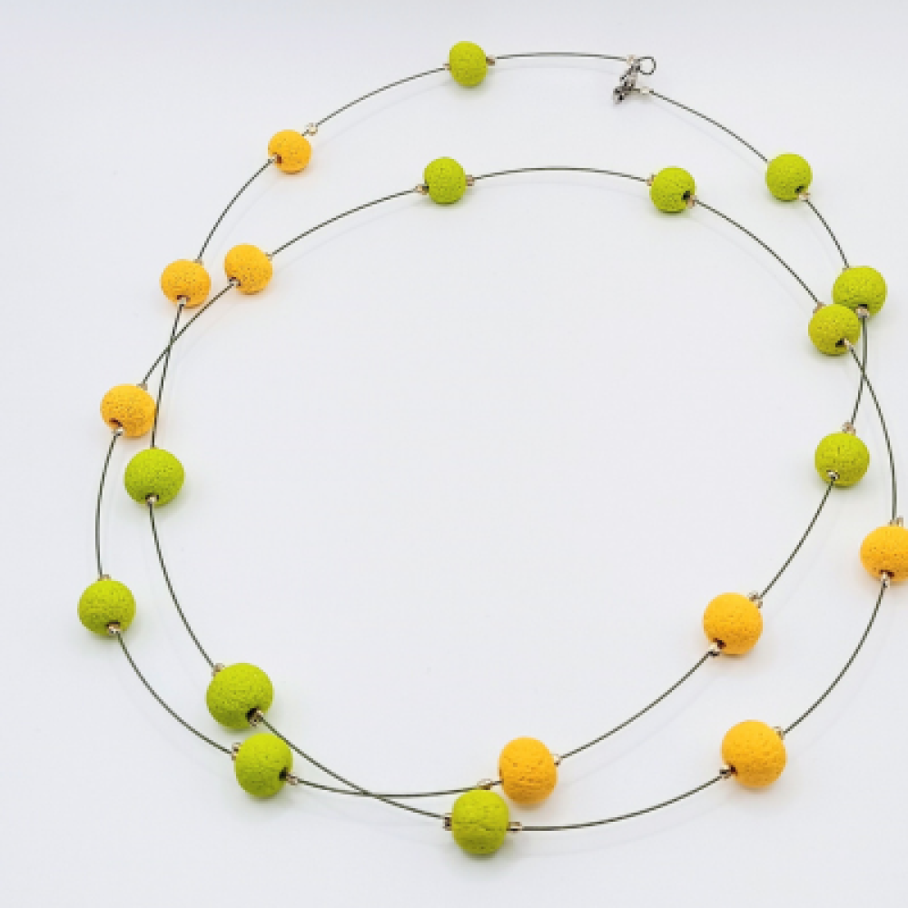 Αυτό το χειροποίητο, μακρύ κολιέ Statement συνδυάζει δύο δυναμικά, φωτεινά χρώματα για ένα χαρούμενο και μοντέρνο αποτέλεσμα. Είναι κατασκευασμένο με στρογγυλές χάντρες από πολυμερή πηλό που διαφέρουν σε μέγεθος (μικρές και μεγάλες). Οι χάντρες εναλλάσσονται σε χρώμα: έντονο λαχανί/κίτρινο-πράσινο και φωτεινό κίτρινο/πορτοκαλί. Όλες οι χάντρες έχουν την χαρακτηριστική ανάγλυφη υφή λάβας (lava effect). Είναι τοποθετημένες διάσπαρτα σε ατσαλόσυρμα, δημιουργώντας μια ελαφριά και αφηρημένη διάταξη. Φοριέται ως μονόκλωνο κολιέ και ολοκληρώνεται με διακριτικό κούμπωμα σε ασημί τόνο. Υλικό: Χάντρες/ Πολυμερής Πηλός Κλωστή/Σύρμα: Ατσαλόσυρμα Χρώμα: Λαχανί (Lime) & Κίτρινο/Πορτοκαλί (Bicolor) Σχήμα: Στρογγυλές Χάντρες (Διάσπαρτες, Μικρές & Μεγάλες) Υφή: Lava Effect (Ανάγλυφη, Ματ) Στυλ: Statement / Μακρύ / Abstract
