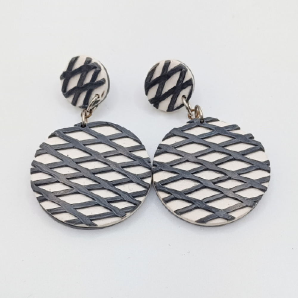 Αυτά τα χειροποίητα κρεμαστά σκουλαρίκια είναι ένα statement κομμάτι με μοναδικό γραμμικό και ανάγλυφο σχέδιο. Το σχέδιό τους αποτελείται από ένα μικρό στρογγυλό καρφωτό και ένα μεγάλο, στρογγυλεμένο/οβάλ τμήμα που κρέμεται. Το μοτίβο είναι ιδιαίτερο: μια βάση σε αποχρώσεις του λευκού, με γραμμές που διασταυρώνονται σε μαύρο/σκούρο χρώμα, δημιουργώντας την αίσθηση του πλεκτού ή ενός δικτυωτού μοτίβου. Κατασκευασμένα από πολυμερή πηλό (fimo), είναι εξαιρετικά ελαφριά και ιδανικά για να προσθέσετε έναν δυναμικό, Art Deco τόνο στην εμφάνισή σας. Χρώμα: Άσπρο/Εκρού, Μαύρο (Γραμμικό/Πλεκτό Μοτίβο) Υλικό: Πολυμερής Πηλός Κούμπωμα:Ατσάλι Διαστάσεις:6.5cm Στυλ: Statement / Γεωμετρικό / Πλεκτό / Art Deco