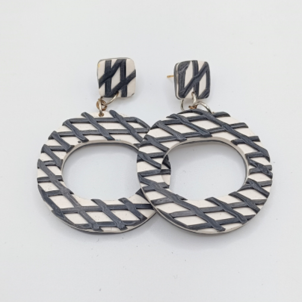 Αυτά τα χειροποίητα κρεμαστά σκουλαρίκια αποτελούν ένα μονόχρωμο statement που συνδυάζει τη διαχρονική φόρμα του κρίκου με ένα έντονο, γραμμικό μοτίβο. Το μεγάλο, κυκλικό τμήμα κρέμεται από ένα μικρό τετράγωνο καρφωτό στη βάση, και τα δύο φέρουν το ίδιο πλεκτό μοτίβο. Το ανάγλυφο πλεκτό/δικτυωτό μοτίβο σε άσπρο και σκούρο ανθρακί/μαύρο δημιουργεί μια δυναμική αντίθεση και προσδίδει υφή. Κατασκευασμένα από πολυμερή πηλό (fimo), είναι εξαιρετικά ελαφριά, καθιστώντας τα ιδανικά για καθημερινές εμφανίσεις με στυλ. Χρώμα: Άσπρο, Μαύρο/Ανθρακί (Πλεκτό Μοτίβο) Σχήμα: Κρίκος (Κυκλικός) & Τετράγωνο (Βάση) Υλικό: Πολυμερής Πηλός Κούμπωμα: Καρφωτό Ατσάλι Διαστάσεις:6.5cm Στυλ: Statement / Γεωμετρικό / Πλεκτό / Μονόχρωμο