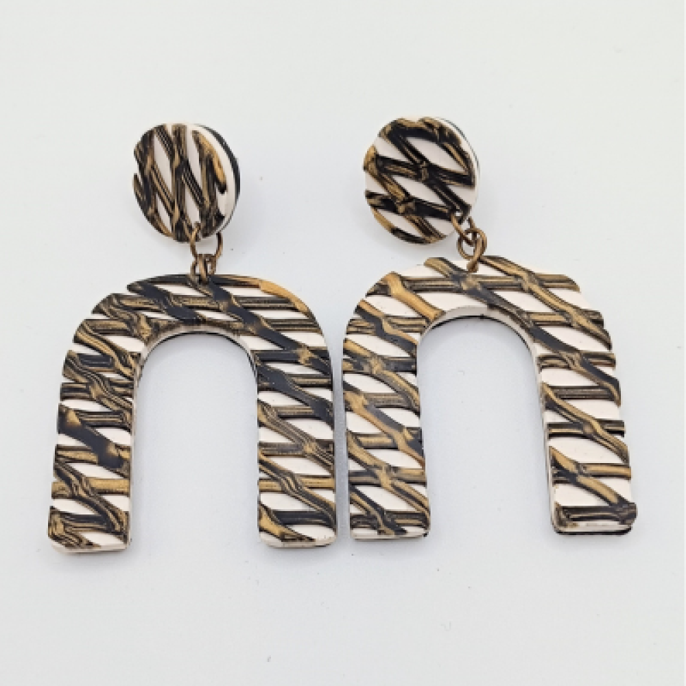 Αυτά τα χειροποίητα σκουλαρίκια αποτελούν ένα Art Deco/Boho statement με δυναμική, τοξοειδή γεωμετρία! Αποτελούνται από ένα μικρό στρογγυλό καρφωτό στη βάση και ένα μεγάλο, τοξοειδές τμήμα που κρέμεται. Το μοτίβο είναι ιδιαίτερο: μια βάση από λευκό/ιβουάρ με ανάγλυφες γραμμές που διασταυρώνονται, δημιουργώντας την αίσθηση του πλεκτού ή δικτυωτού, σε αποχρώσεις του χρυσού, μπροζέ και σκούρου καφέ/μαύρου. Η μοναδική αυτή χρωματική παλέτα προσδίδει μια vintage/αντίκ αίσθηση. Κατασκευασμένα από πολυμερή πηλό (fimo), είναι εξαιρετικά ελαφριά. Χρώμα: Άσπρο, Χρυσό, Αντίκ Μπροζέ (Πλεκτό Μοτίβο) Σχήμα: Πέταλο / Καμάρα (Κρεμαστό) Υλικό: Πολυμερής Πηλός Κούμπωμα:Ατσάλι Διαστάσεις:6.5cm Στυλ: Statement / Art Deco / Boho / Vintage