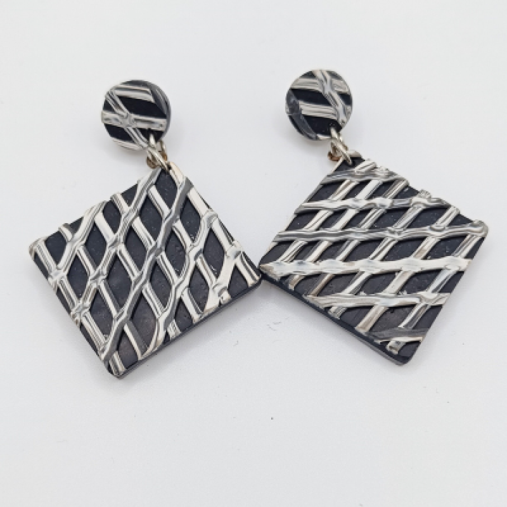 Αυτά τα χειροποίητα κρεμαστά σκουλαρίκια είναι το απόλυτο Art Deco statement κομμάτι με μοντέρνα αισθητική! Το σχήμα τους είναι ρόμβος/τετράγωνο που κρέμεται από ένα στρογγυλό καρφωτό. Το μοτίβο είναι ιδιαίτερο: μια βάση από μαύρο ή πολύ σκούρο χρώμα με λευκές γραμμές που διασταυρώνονται, δημιουργώντας την αίσθηση του πλεκτού ή ενός αφηρημένου γραμμικού σχεδίου. Κατασκευασμένα από πολυμερή πηλό (fimo), είναι εξαιρετικά ελαφριά και ιδανικά για να προσθέσετε έναν δραματικό, γεωμετρικό τόνο σε κάθε σας εμφάνιση. Χρώμα: Άσπρο, Μαύρο (Γραμμικό/Πλεκτό Μοτίβο) Υλικό: Πολυμερής Πηλός Κούμπωμα:Ατσάλι Διαστάσεις:6cm Στυλ: Art Deco / Statement / Γεωμετρικό / Abstract