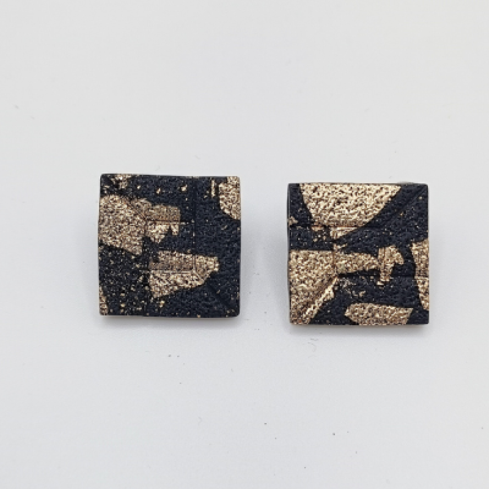 Αυτά τα χειροποίητα καρφωτά σκουλαρίκια είναι μία εκλεπτυσμένη επιλογή για διακριτικό αλλά δυναμικό στυλ. Το μικρό τετράγωνο σχήμα είναι ιδανικό για καθημερινή χρήση, ενώ η υφή τους τα κάνει μοναδικά. Το Μαύρο χρώμα έχει μία ανάγλυφη υφή που θυμίζει αδρό βράχο ή φλοιό δέντρου, πάνω στο οποίο λάμπουν τα ενσωματωμένα Χρυσά Φύλλα. Προσφέρουν ένα Luxe Minimal Statement με Urban Chic διάθεση. Προδιαγραφές: