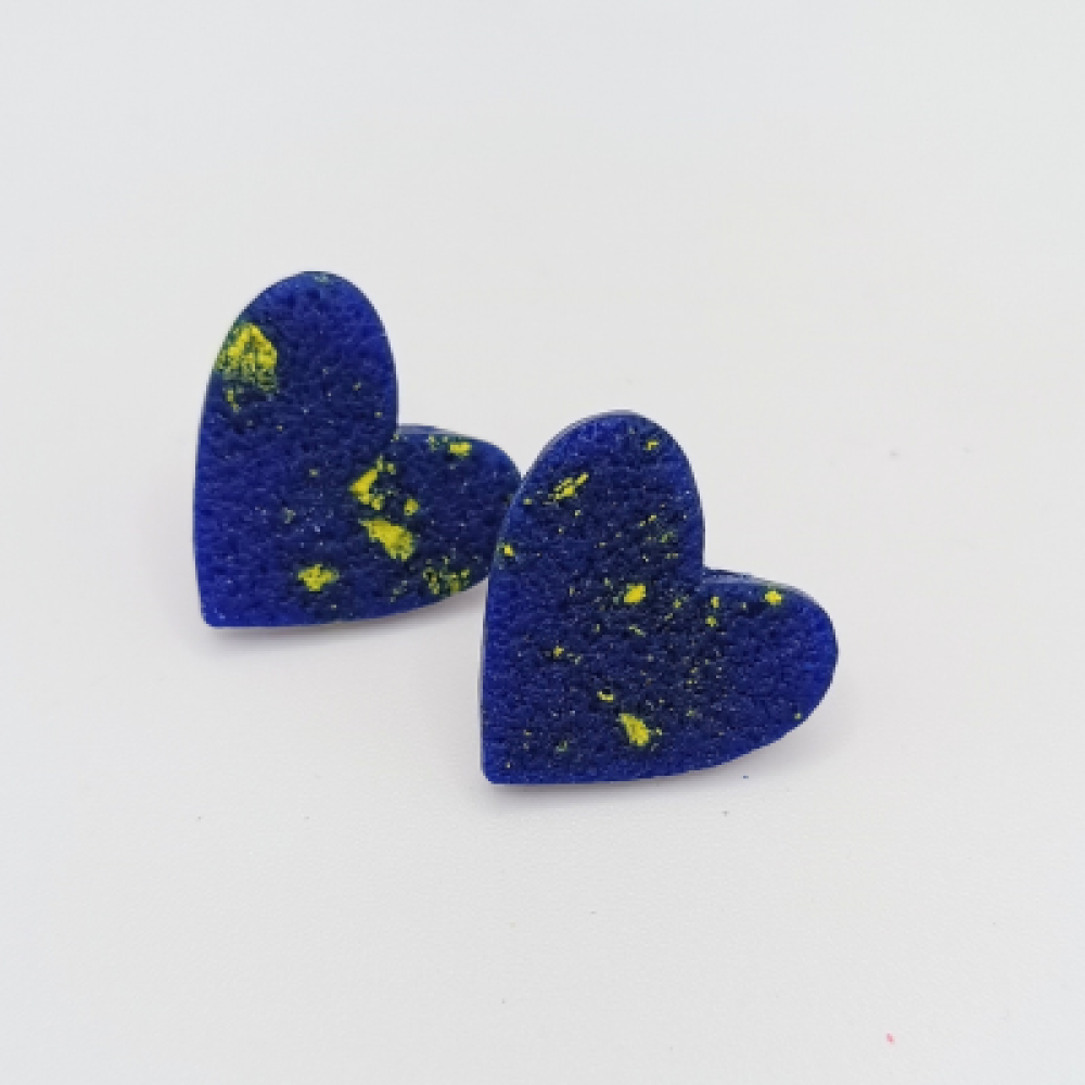 : Για εσάς που αγαπάτε το διαφορετικό και την τέχνη! Αυτά τα χειροποίητα σκουλαρίκια-καρδιές έχουν μια έντονη, βαθιά μπλε βάση, η οποία διακόπτεται από ζωηρές κίτρινες πιτσιλιές (splatter effect), δημιουργώντας ένα στυλ που παραπέμπει σε Abstract Art ή νυχτερινό ουρανό με αστερόσκονη. Η επιφάνεια έχει μια ενδιαφέρουσα ανάγλυφη υφή. Κατασκευασμένα από πολυμερή πηλό (fimo), είναι εξαιρετικά ελαφριά και άνετα. Είναι το τέλειο statement κομμάτι για να αναδείξετε την προσωπικότητά σας και να προσθέσετε μια δημιουργική πινελιά σε κάθε σας ντύσιμο. Χρώμα: Μπλε (Έντονο) με Κίτρινες Πιτσίλες Υλικό: Πολυμερής Πηλός (Fimo) Κούμπωμα:Ατσάλι Διαστάσεις:4cm Στυλ: Abstract Art / Statement / Textured (Ανάγλυφο) / Pop