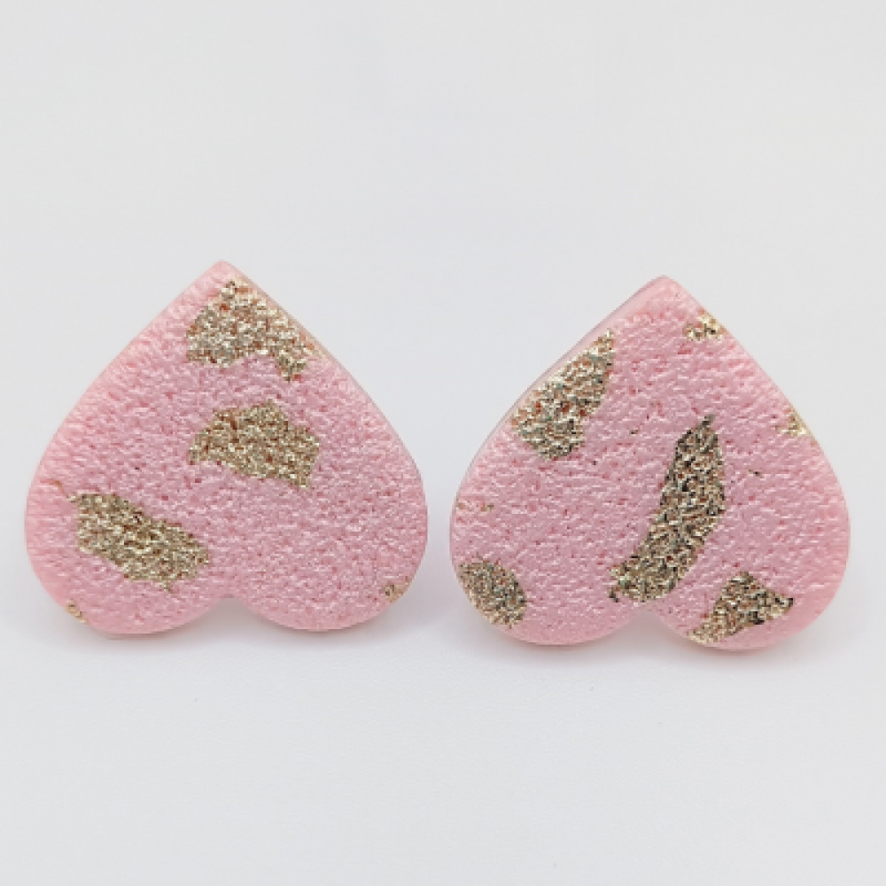 Αυτά τα χειροποίητα σκουλαρίκια-καρφάκια αποτελούν ένα ρομαντικό και παιχνιδιάρικο κόσμημα. Το σχέδιο είναι καρφωτό (stud) και έχει σχήμα καρδιάς. Η βάση τους είναι σε απαλό Παστέλ Ροζ χρώμα και διαθέτουν μια χαρακτηριστική σαγρέ / ανάγλυφη υφή. Η διακόσμηση περιλαμβάνει διάσπαρτα, ακανόνιστα κομμάτια χρυσού (Gold Flakes), προσδίδοντας μια λαμπερή, glamorous πινελιά. Χρώμα: Παστέλ Ροζ & Χρυσό Υλικό: Πολυμερικός Πηλός & Μεταλλικά στοιχεία / Φύλλα Χρυσού Κούμπωμα: Καρφάκι (Stud) Διαστάσεις: 4cm Στυλ: Heart Studs, Gold Flakes, Textured Finish, Romantic