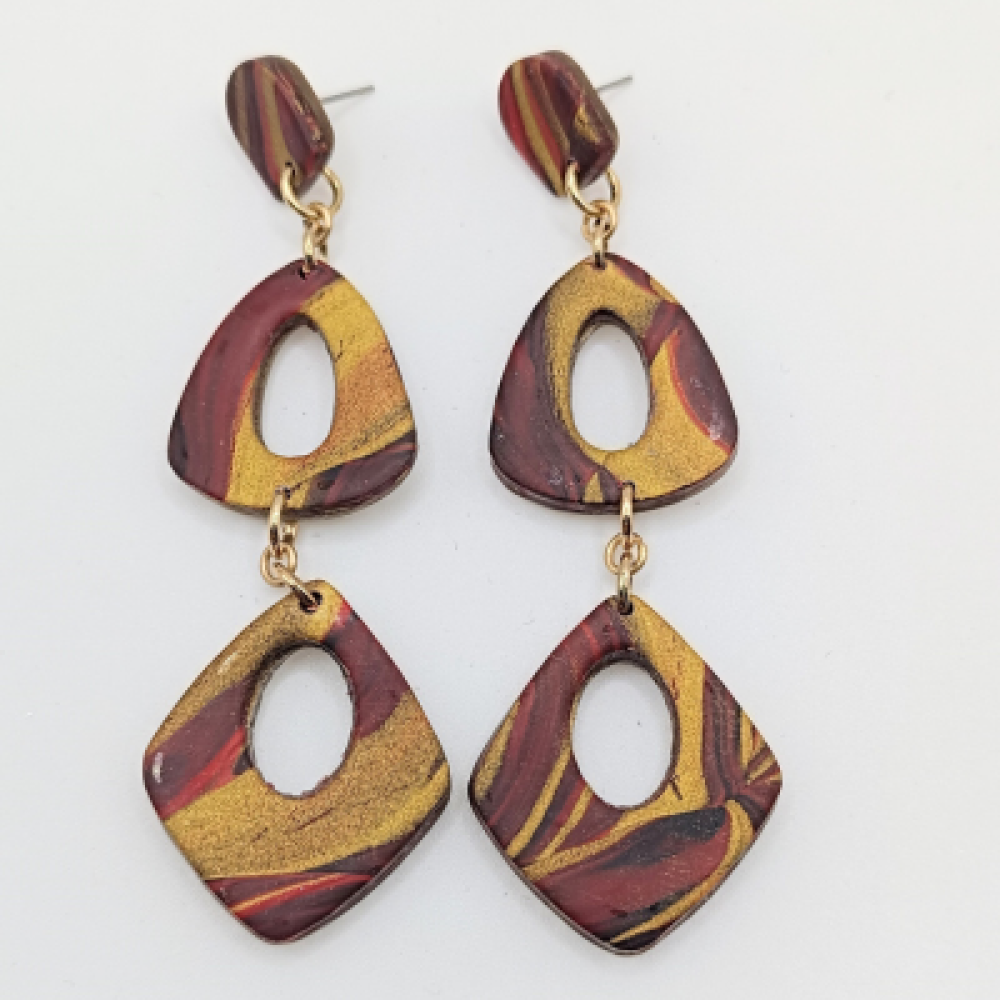 Αυτά τα χειροποίητα σκουλαρίκια είναι ένα statement κόσμημα με μοντέρνο και Glamorous χαρακτήρα. Το σχέδιο είναι μακρύ, με δύο κρεμαστά, ανοιχτά γεωμετρικά σχήματα (ένα τρίγωνο και έναν ρόμβο). Όλα τα στοιχεία διαθέτουν το ίδιο πλούσιο Metallic Marble μοτίβο, όπου το βαθύ Βυσσινί/Μπορντό αναμειγνύεται με ρέον Χρυσό. Η βάση είναι ένα μικρό στρογγυλό καρφάκι με αντίστοιχο μοτίβο, και όλες οι συνδέσεις είναι χρυσές. Χρώμα: Βυσσινί/Μπορντό & Χρυσό (Metallic Marble) Υλικό: Πολυμερικός Πηλός & Μεταλλικά στοιχεία Κούμπωμα: Καρφάκι (Stud) Διαστάσεις: 6.5cm Στυλ: Statement Dangles, Geometric Open Shape, Metallic Marble