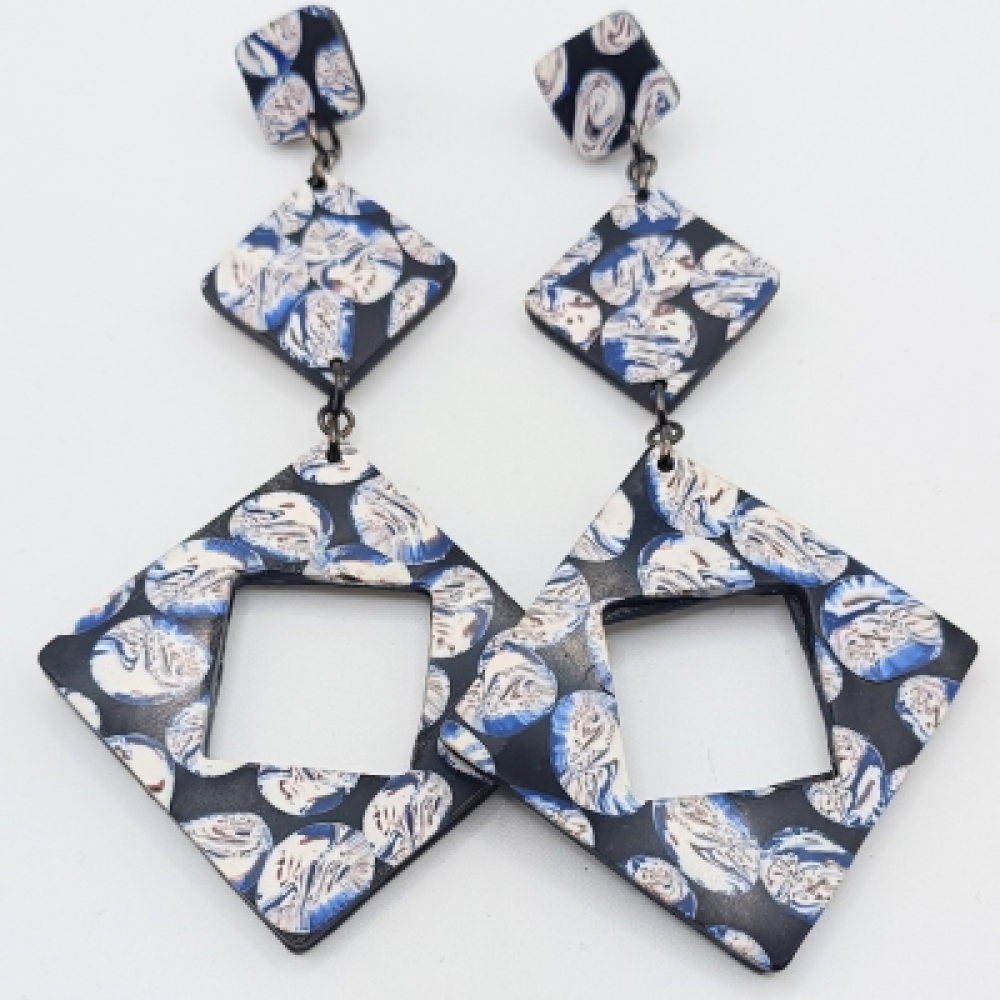 Αυτά τα χειροποίητα σκουλαρίκια αποτελούν ένα τολμηρό Statement κόσμημα με έντονο γεωμετρικό στυλ. Το σχέδιο είναι κρεμαστό (Dangles) και αποτελείται από τρεις συνδεδεμένους ρόμβους (τετράγωνα τοποθετημένα διαγώνια). Ο μεγαλύτερος ρόμβος στο κάτω μέρος είναι ανοιχτός (Open Cutout). Η βάση είναι Μαύρη, πάνω στην οποία αναπτύσσεται ένα μοτίβο με στροβιλισμούς Λευκού, Γκρι και Μπλε, που θυμίζει είτε Floral/Λουλούδια είτε Marble/Μωσαϊκό. Οι μεταλλικές συνδέσεις και το κούμπωμα είναι Μαύρο/Ανθρακί. Χρώμα: Μαύρο, Λευκό, Γκρι, Μπλε (Floral/Mosaic Pattern) Υλικό: Πολυμερικός Πηλός & Μεταλλικά στοιχεία (Μαύρο/Ανθρακί) Κούμπωμα: Καρφάκι Ατσάλι Κατηγορία: Floral Διαστάσεις: 9cm Στυλ: Statement Dangles, Geometric Rhombus, Floral Black