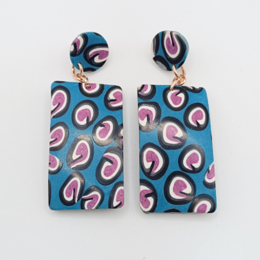 Αυτά τα χειροποίητα σκουλαρίκια-Dangles αποτελούν ένα νεανικό και εκκεντρικό Statement κόσμημα. Το σχέδιο είναι κρεμαστό, αποτελούμενο από ένα στρογγυλό καρφάκι από το οποίο κρέμεται ένα μεγάλο κομμάτι σε σχήμα Τετραγώνου/Ορθογωνίου. Το μοτίβο είναι μια Pop εκδοχή του Animal Print, με βάση Μπλε/Τυρκουάζ και κηλίδες σε έντονο Φούξια/Μωβ και Μαύρο περίγραμμα. Η μεταλλική σύνδεση είναι σε Χρυσό/Ροζ Χρυσό Χρώμα: Τυρκουάζ/Μπλε, Φούξια/Μωβ, Μαύρο (Animal Print) Υλικό: Πολυμερικός Πηλός & Μεταλλικά στοιχεία Κούμπωμα: Καρφάκι (Stud) Διαστάσεις: 6cm Στυλ: Statement Dangles, Pop Animal Print, Geometric Square