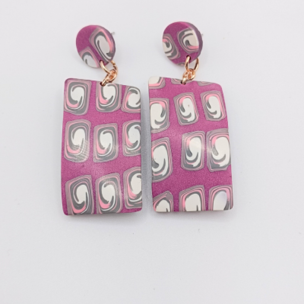 Αυτά τα χειροποίητα σκουλαρίκια-Dangles αποτελούν ένα χαρούμενο και μοντέρνο Statement κόσμημα. Το σχέδιο είναι κρεμαστό, αποτελούμενο από ένα μικρό οβάλ καρφάκι από το οποίο κρέμεται ένα μεγάλο κομμάτι σε ελαφρώς στρογγυλεμένο τετράγωνο. Η βάση είναι σε έντονο Φούξια με διακριτικό Glitter. Το μοτίβο αποτελείται από επαναλαμβανόμενα τετράγωνα που περιέχουν στροβιλισμούς Λευκού, Γκρι και Ροζ, δίνοντας την αίσθηση ενός σύγχρονου ψηφιδωτού (Modern Mosaic). Η μεταλλική σύνδεση είναι σε Ροζ Χρυσό. Χρώμα: Φούξια/Μωβ, Λευκό, Γκρι, Ροζ (Mosaic Marble) Υλικό: Πολυμερικός Πηλός & Μεταλλικά στοιχεία (Ροζ Χρυσό) Κούμπωμα: Καρφάκι (Stud) Διαστάσεις: 6cm Στυλ: Statement Dangles, Geometric Square, Pink Mosaic