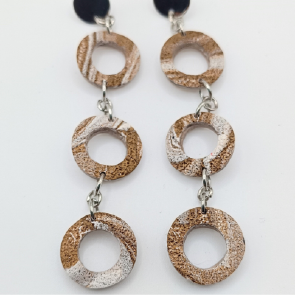 Αυτά τα χειροποίητα σκουλαρίκια αποτελούν ένα κομψό και μοντέρνο κόσμημα. Η σύνθεση με τρεις μικρούς κρίκους, που συνδέονται με ασημί αλυσίδες, δημιουργεί ένα εντυπωσιακό μήκος. Οι κρίκοι διαθέτουν σχέδιο που θυμίζει Μάρμαρο σε αποχρώσεις του Καφέ και του Μπεζ. Η βάση (καρφάκι) είναι ένα διακριτικό μαύρο στοιχείο. Ιδανικά για να προσθέσετε έναν Earthy Chic τόνο στην εμφάνισή σας. Χρώμα: Καφέ & Μπεζ/Λευκό (Μοτίβο Μάρμαρο) Υλικό: Πολυμερικός Πηλός & Μεταλλικά στοιχεία Κούμπωμα: Ανοξείδωτο Ατσάλι Διαστάσεις: 6.5cm Στυλ: Long Dangles, Earthy Chic, Geometric Statement