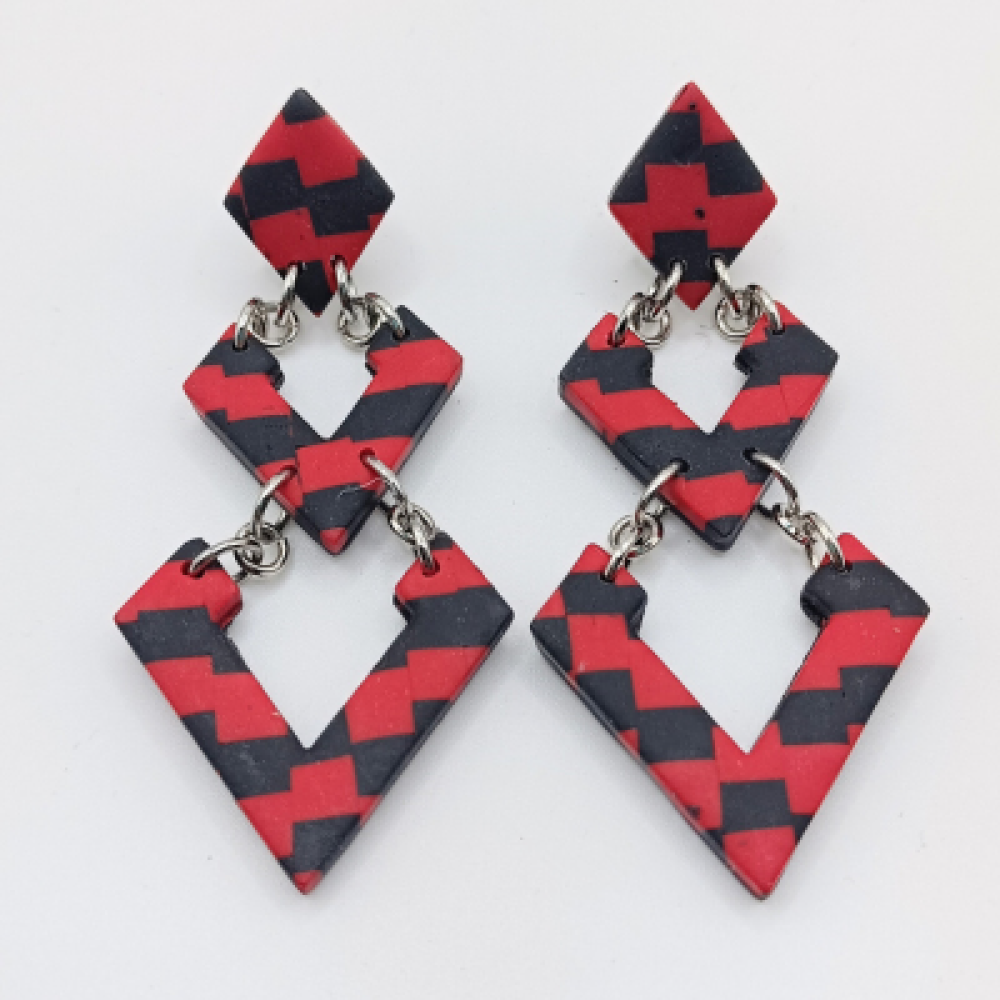 Αυτά τα χειροποίητα σκουλαρίκια αποτελούν ένα τολμηρό και εκρηκτικό κόσμημα. Ο σχεδιασμός τους είναι εμπνευσμένος από το Pop Art και τη γεωμετρία, με το χαρακτηριστικό μοτίβο σκακιέρας (Checkerboard) σε έντονο Κόκκινο και Μαύρο. Το ορθογώνιο σχήμα είναι κρεμαστό και συνδέεται με ένα διακριτικό μαύρο stud, εξασφαλίζοντας άνετη εφαρμογή. Πρόκειται για ένα δυναμικό αξεσουάρ που προσθέτει μια παιχνιδιάρικη και ρετρό διάθεση στο στυλ σας. Προδιαγραφές: