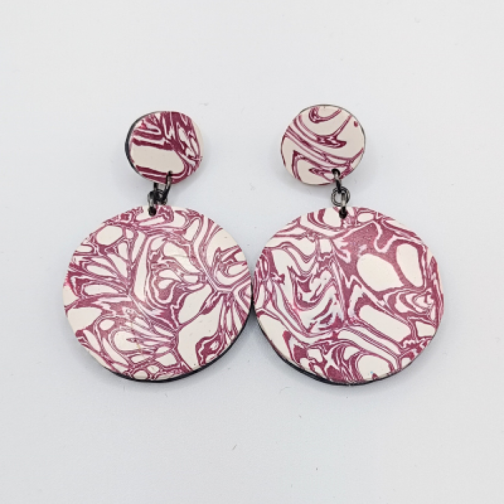 Αυτά τα χειροποίητα κρεμαστά σκουλαρίκια είναι μία εκλεπτυσμένη επιλογή για σύγχρονο και Artistic στυλ. Το στρογγυλό σχήμα και η διπλή σύνδεση προσδίδουν όγκο και κίνηση. Το Marble μοτίβο σε Βυσσινί/Μωβ και Λευκό/Μπεζ εξασφαλίζει ότι κάθε ζευγάρι είναι μοναδικό. Η μαύρη μεταλλική σύνδεση τονίζει τον μοντέρνο χαρακτήρα του κοσμήματος. Χρώμα: Βυσσινί/Μωβ & Λευκό/Μπεζ (Marble Μοτίβο) Υλικό: Πολυμερικός Πηλός & Μεταλλικά στοιχεία Κούμπωμα: Καρφάκι (Stud) Διαστάσεις: 6cm Στυλ: Dangles, Artistic Marble, Statement Circle