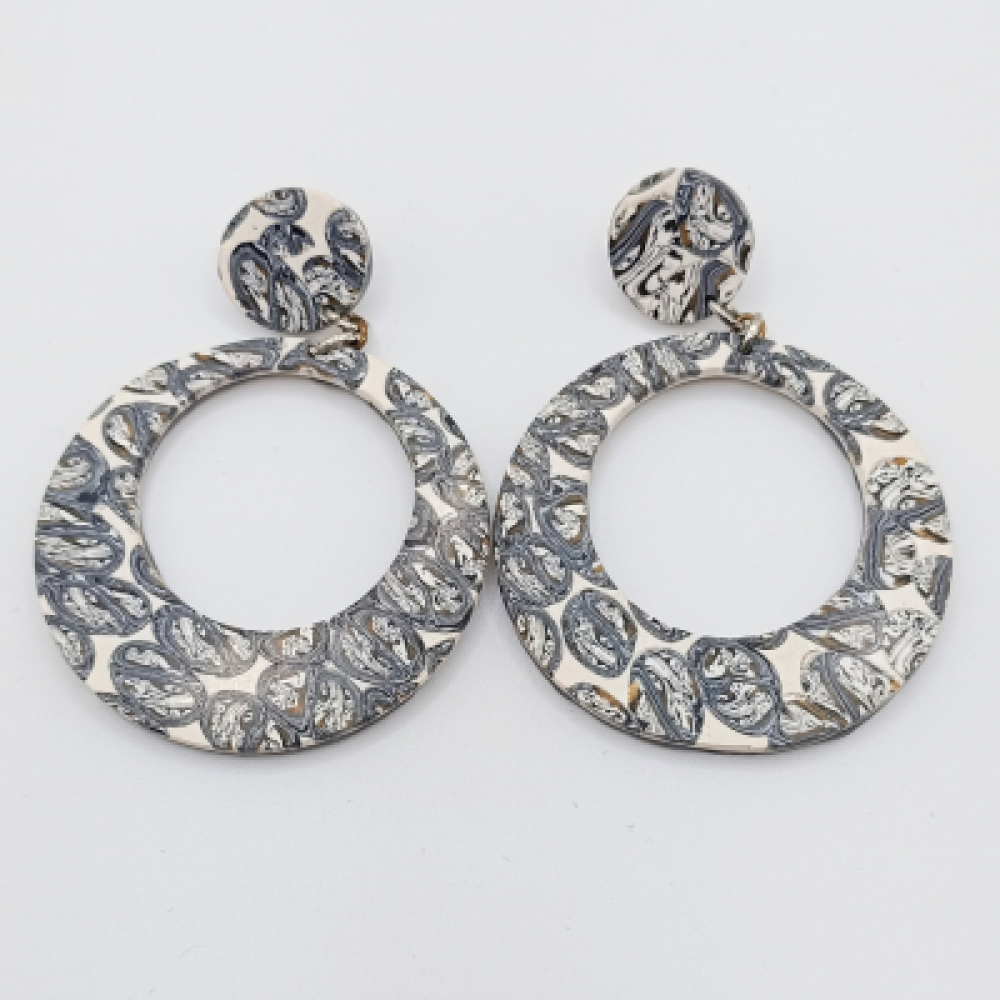 Αυτά τα χειροποίητα σκουλαρίκια-κρίκοι αποτελούν ένα μοντέρνο statement κόσμημα, με καθαρές γραμμές και εντυπωσιακό μέγεθος. Ο μεγάλος κρίκος (Hoop) είναι ελαφρύς και κρεμαστός από ένα μικρό στρογγυλό καρφάκι. Το μοτίβο είναι ένα ρευστό Marble, που συνδυάζει διάφορους τόνους του Γκρι με Λευκό/Άσπρο, προσδίδοντας μια πολυτελή, μινιμαλιστική εμφάνιση. Χρώμα: Γκρι & Άσπρο (Marble) Υλικό: Πολυμερικός Πηλός & Μεταλλικά στοιχεία Κούμπωμα: Καρφάκι Ατσάλι Κατηγορία: Floral Διαστάσεις: 7cm Στυλ: Statement Hoops, Marble Geometric, Minimal Grey