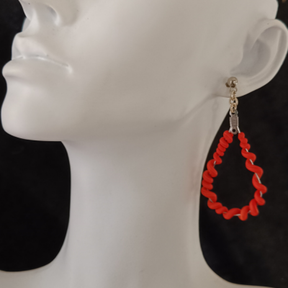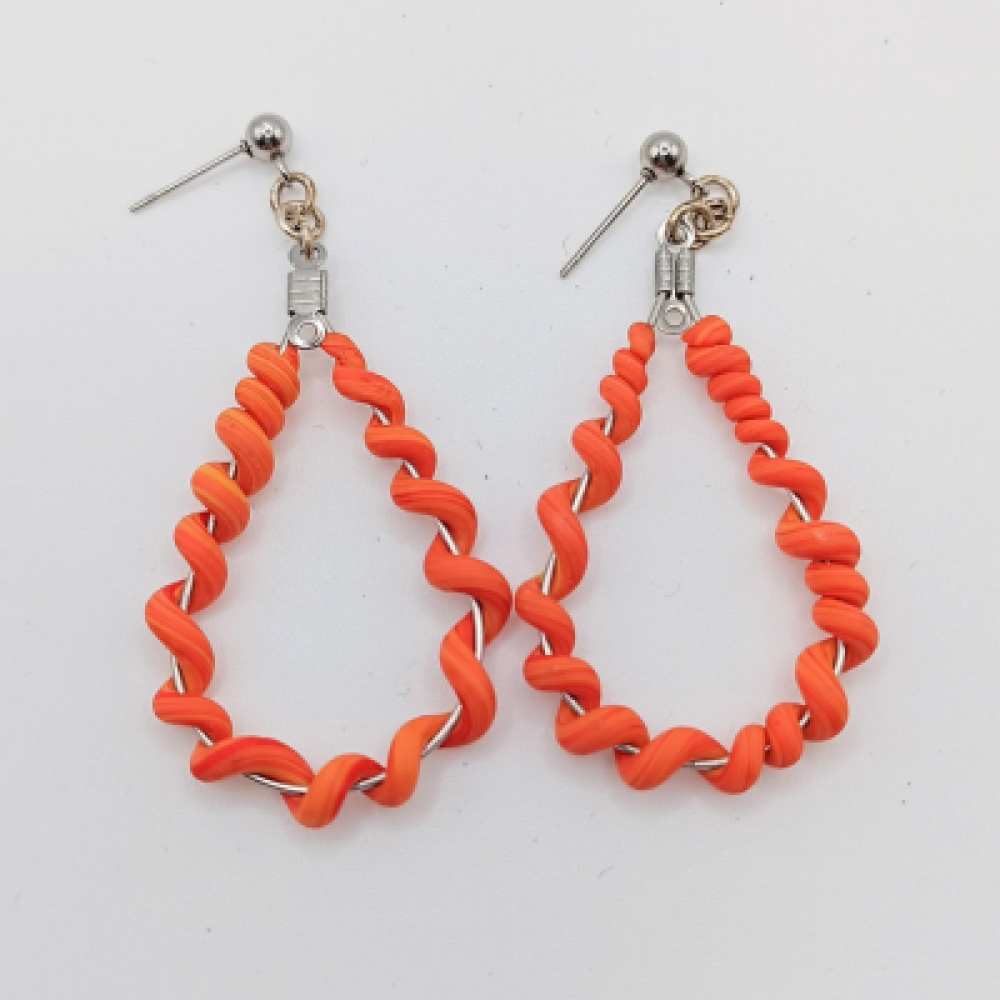 Αυτά τα χειροποίητα σκουλαρίκια-κρίκοι αποτελούν ένα φωτεινό και παιχνιδιάρικο κόσμημα. Το σχέδιο είναι κρεμαστό, αποτελούμενο από:Mία σταγόνα κρίκο που σχηματίζεται από ένα στριφογυριστό/σπείρα υλικό σε ζεστό Πορτοκαλί χρώμα. Το μέγεθός τους είναι μεσαίο προς μικρό, ιδανικό για καθημερινή χρήση και για προσθήκη pop χρώματος. Χρώμα: Πορτοκαλί (Στριφογυριστό) Υλικό: [Πολυμερικός Πηλός] & Μεταλλικά στοιχεία (Ασημί) Κούμπωμα: Καρφάκι (Stud) Διαστάσεις: 6cm Στυλ: Coiled Hoops, Spiral, Summer Statement