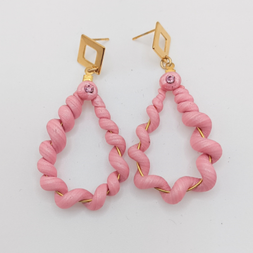 Αυτά τα χειροποίητα σκουλαρίκια-κρίκοι αποτελούν ένα φωτεινό και παιχνιδιάρικο κόσμημα. Το σχέδιο είναι κρεμαστό, αποτελούμενο από:Μία σταγόνα που σχηματίζεται από ένα στριφογυριστό/σπείρα υλικό σε ζεστό Ροζ χρώμα και στρας. Το μέγεθός τους είναι μεσαίο προς μικρό, ιδανικό για καθημερινή χρήση και για προσθήκη pop χρώματος. Χρώμα: Ροζ & στρας (Στριφογυριστό) Υλικό: [Πολυμερικός Πηλός] & Μεταλλικά στοιχεία Κούμπωμα: Καρφάκι (Stud) Διαστάσεις: 6cm Στυλ: Coiled Hoops, Spiral, Summer Statement