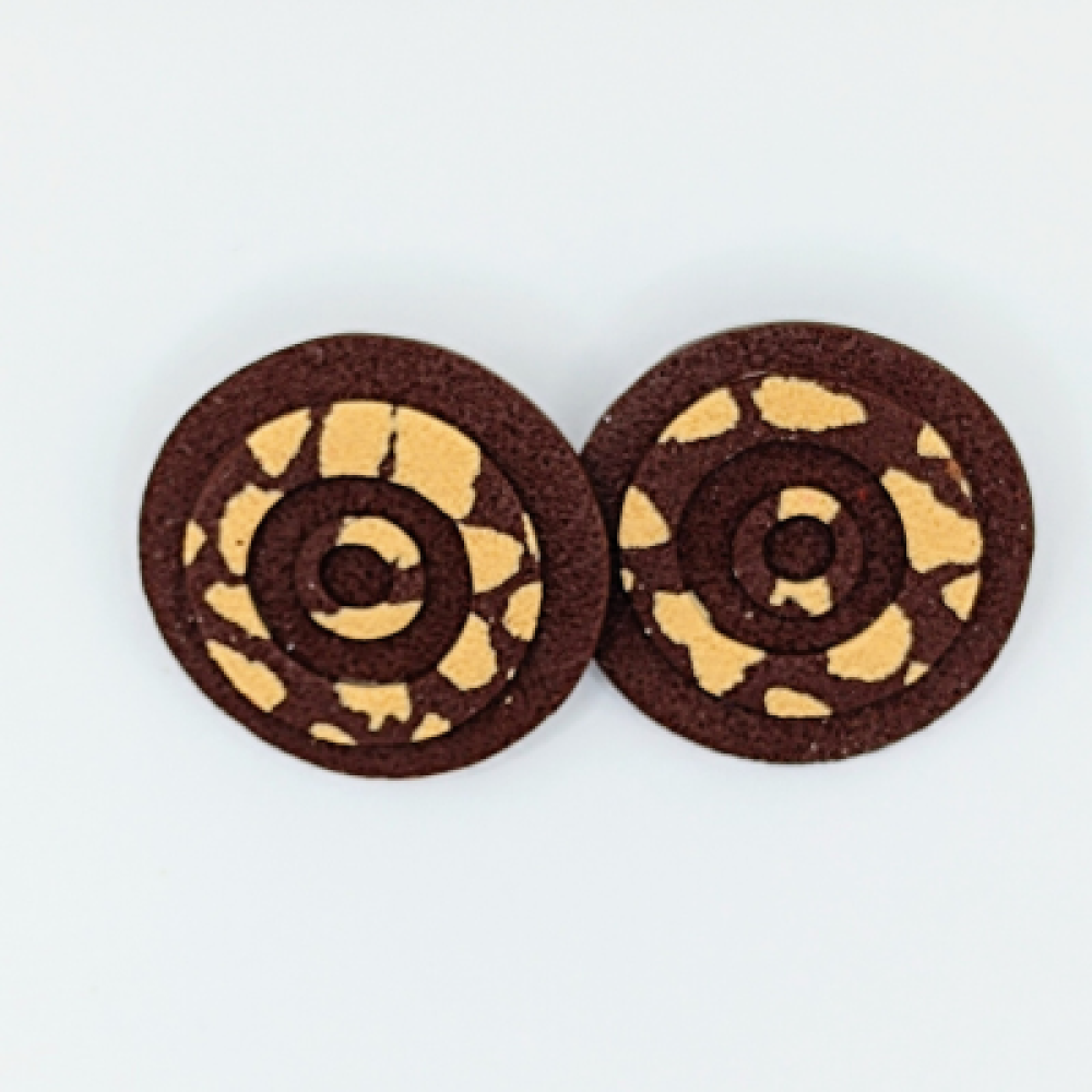 Αυτά τα χειροποίητα καρφωτά σκουλαρίκια είναι μία εκλεπτυσμένη επιλογή για μοντέρνο και δυναμικό στυλ. Το στρογγυλό σχήμα είναι διαχρονικό, ενώ το ομόκεντρο μοτίβο συνδυάζεται με Animal Print αναφορές. Οι ζεστοί τόνοι του Σκούρου Καφέ και του Μπεζ/Χακί δημιουργούν ένα ενδιαφέρον οπτικό εφέ. Η ανάγλυφη υφή προσδίδει μια αίσθηση χειροτεχνίας. Χρώμα: Σκούρο Καφέ & Μπεζ/Χακί (Animal Print & Μοτίβο Στόχου) Υλικό: Πολυμερικός Πηλός Κούμπωμα: Ανοξείδωτο Ατσάλι Διαστάσεις: 5cm Στυλ: Geometric Studs, Animal Print, Earthy Chic