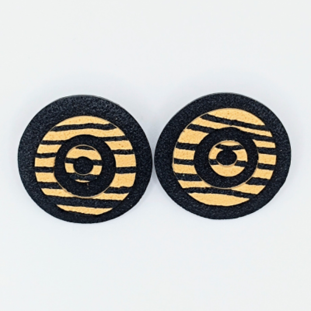 Αυτά τα χειροποίητα καρφωτά σκουλαρίκια είναι μία εκλεπτυσμένη επιλογή για μοντέρνο και δυναμικό στυλ. Το στρογγυλό σχήμα είναι διαχρονικό, ενώ το ομόκεντρο μοτίβο (Bullseye) σε Μαύρο και Μπεζ/Χακί δημιουργεί ένα οπτικά ενδιαφέρον αποτέλεσμα με Tribal αναφορές. Το ριγέ σχέδιο τονίζεται από την ανάγλυφη, ματ υφή, καθιστώντας τα ιδανικά για να προσθέσετε έναν Urban Chic τόνο στην εμφάνισή σας.Χρώμα: Μαύρο & Μπεζ/Χακί (Ριγέ Μοτίβο Στόχου) Υλικό: Πολυμερικός Πηλός Κούμπωμα: Ανοξείδωτο Ατσάλι Διαστάσεις: 5cm Στυλ: Geometric Studs, Tribal Pop, Urban Chic
