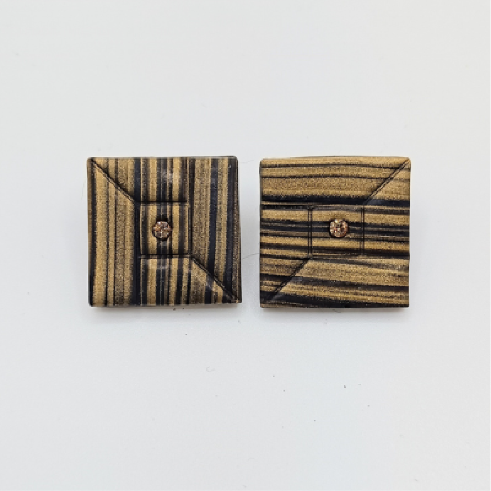 Αυτά τα χειροποίητα καρφωτά σκουλαρίκια είναι μία εκλεπτυσμένη επιλογή για διακριτικό αλλά Artistic στυλ. Το μικρό τετράγωνο σχήμα έχει μια ιδιαίτερη, ελαφρώς αναδιπλωμένη ή ανάγλυφη υφή, που θυμίζει φάκελο ή καπιτονέ μοτίβο. Η επιφάνεια έχει ένα εντυπωσιακό ριγέ μοτίβο σε Μαύρο και Χρυσό/Bronze τόνο, με τα χρώματα να εναλλάσσονται σε λεπτές οριζόντιες λωρίδες. Ένα μικρό, στρογγυλό μεταλλικό κουμπάκι/στρας κοσμεί το κέντρο, προσθέτοντας μία πινελιά λάμψης. Προδιαγραφές: