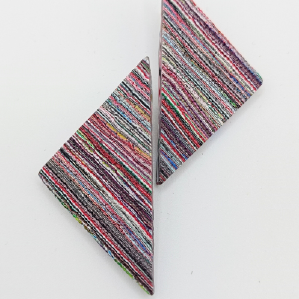 Αυτά τα χειροποίητα καρφωτά σκουλαρίκια είναι μία εκρηκτική και καλλιτεχνική επιλογή. Το τριγωνικό σχήμα είναι μοντέρνο και δυναμικό. Η επιφάνεια είναι ένα μικρό, έντονο έργο τέχνης με το ριγέ Marbled εφέ να εναλλάσσει ρίγες από όλα τα χρώματα του ουράνιου τόξου (Κόκκινο, Πράσινο, Μπλε, Ροζ κ.ά.). Η ανάγλυφη υφή προσδίδει βάθος και μία αίσθηση χειροτεχνίας. Είναι ιδανικά για να προσθέσετε χρώμα και ένταση σε κάθε εμφάνιση.