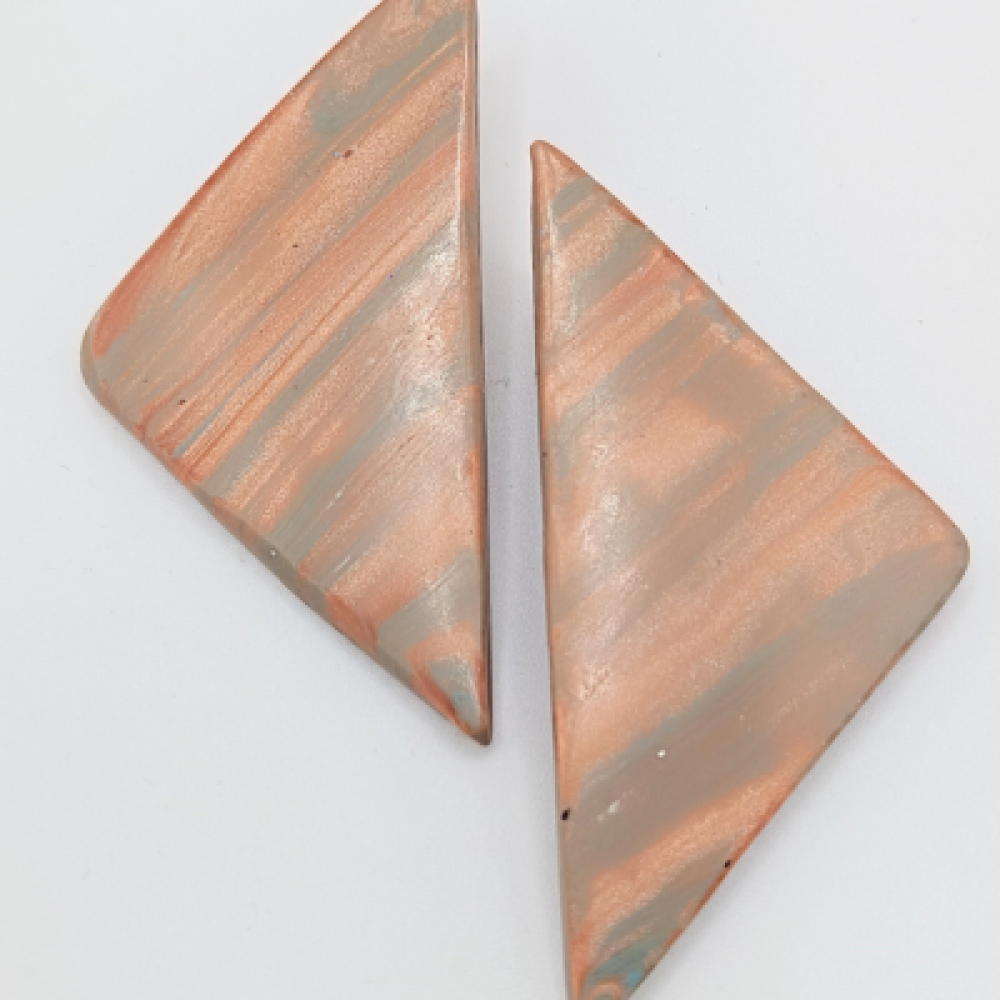 Αυτά τα χειροποίητα καρφωτά σκουλαρίκια είναι μία επιλογή που συνδυάζει την απλή γεωμετρία με την καλλιτεχνική υφή. Το τριγωνικό σχήμα είναι μοντέρνο και δυναμικό. Η επιφάνεια είναι ένα μικρό έργο τέχνης, με το Marbled εφέ να αναδεικνύει τις ζεστές αποχρώσεις του Χαλκού και τις ψυχρές του Γκρι/Μπλε. Αυτή η ρευστή ανάμειξη χρωμάτων δίνει την αίσθηση του μετάλλου και της πέτρας, προσδίδοντας έναν Earthy Luxe τόνο. Είναι ιδανικά για να προσθέσετε χρώμα και στυλ σε κάθε καθημερινή ή βραδινή εμφάνιση. Προδιαγραφές: