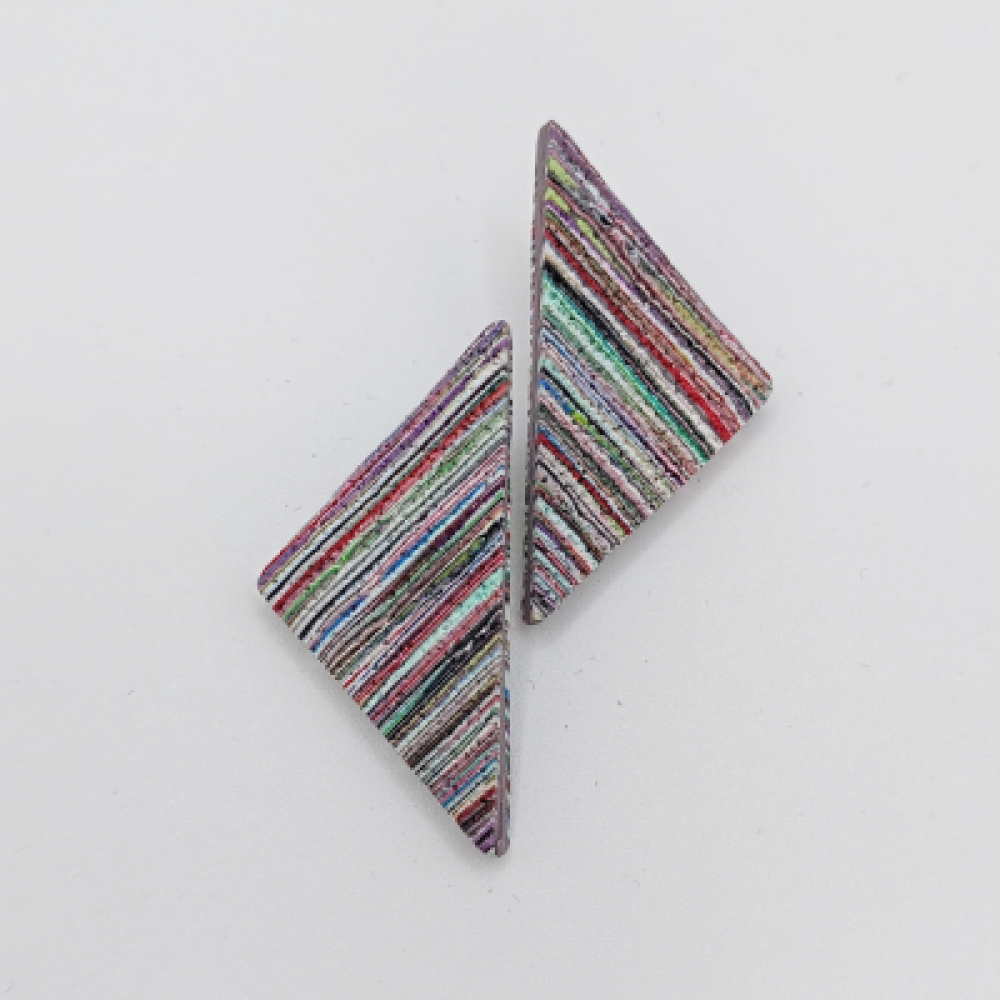 Αυτά τα χειροποίητα καρφωτά σκουλαρίκια είναι μία εκρηκτική και καλλιτεχνική επιλογή. Το τριγωνικό σχήμα είναι μοντέρνο και δυναμικό. Η επιφάνεια είναι ένα μικρό, έντονο έργο τέχνης με το ριγέ Marbled εφέ να εναλλάσσει ρίγες από όλα τα χρώματα του ουράνιου τόξου (Κόκκινο, Πράσινο, Μπλε, Ροζ κ.ά.). Η ανάγλυφη υφή προσδίδει βάθος και μία αίσθηση χειροτεχνίας. Είναι ιδανικά για να προσθέσετε χρώμα και ένταση σε κάθε εμφάνιση.