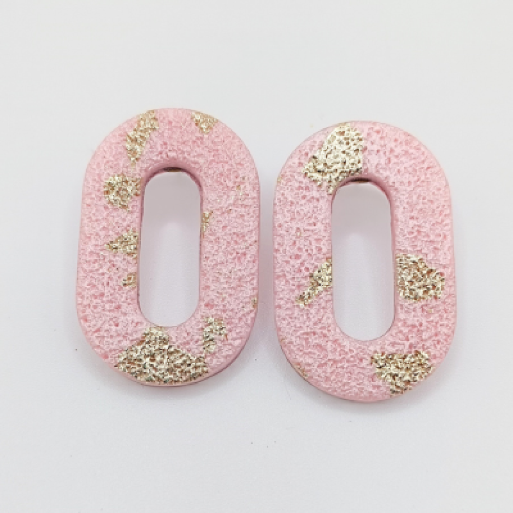Αυτά τα χειροποίητα καρφωτά σκουλαρίκια είναι μία χαριτωμένη και μοντέρνα επιλογή για να προσθέσετε χρώμα και λάμψη στην εμφάνισή σας.Το σχήμα τους είναι οβάλ,δημιουργώντας ένα διακριτικό αλλά εντυπωσιακό Statement.To παστέλ ροζ χρώμα έχει μία ανάγλυφη,ελαφρώς τραχιά υφή,στην οποία είναι ενσωματωμένα μικρά ακανόνιστα χρυσά φύλλα.Είναι ιδανικά για καθημερινή χρήση ή για να ολοκληρώσετε ένα pop-chic look.