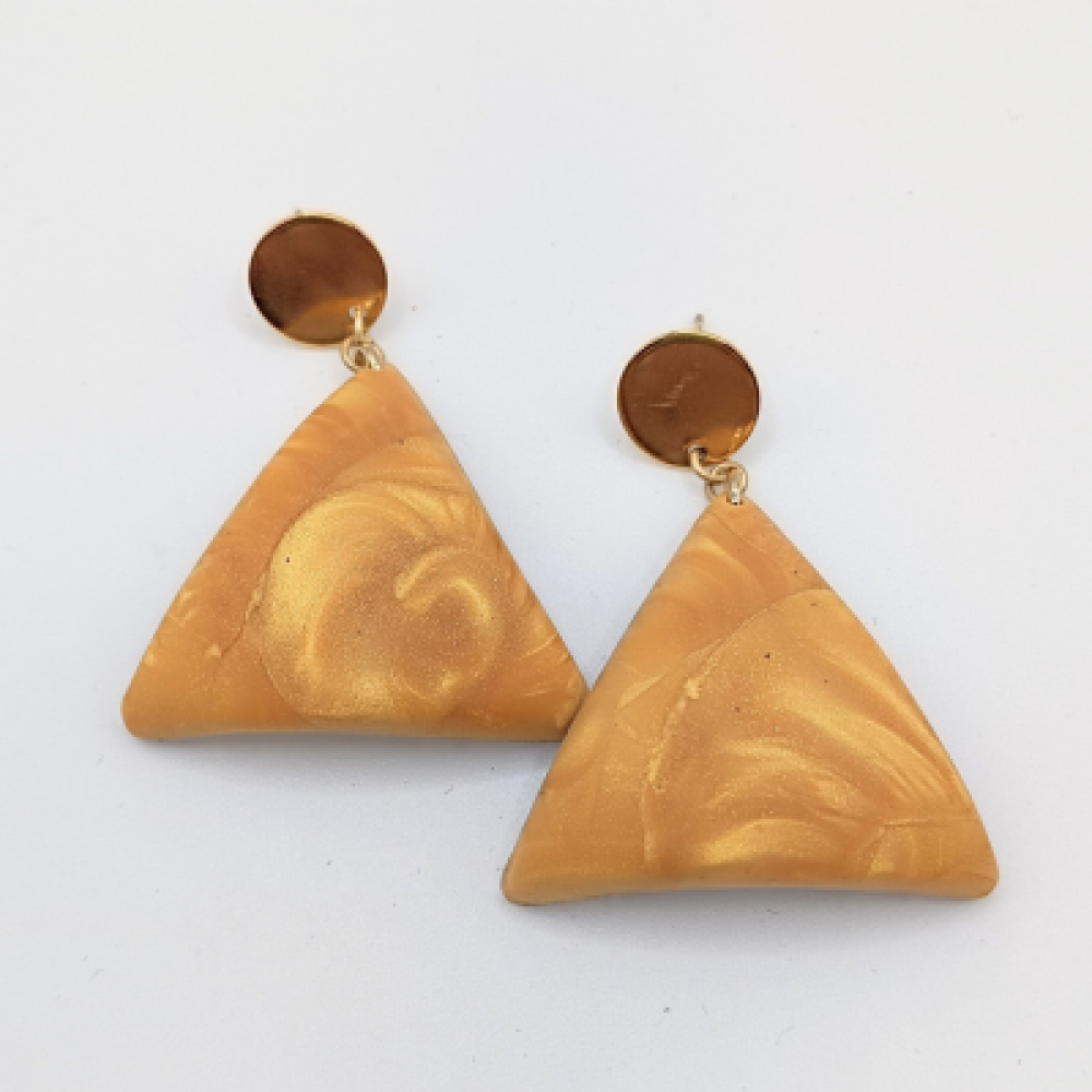 Δυναμική γεωμετρία και πολυτελές χρυσό swirl.Αυτά τα χειροποίητα κρεμαστά σκουλαρίκια είναι μία τολμηρή και καλλιτεχνική επιλογή.Το έντονο τριγωνικό σχήμα και η ρευστή υφή του χρώματος δημιουργούν ένα κόσμημα που είναι ταυτόχρονα σύγχρονο και πολυτελές.Δυναμικό σχήμα,Swirl εφέ,glam σύνδεση,artistic και ελαφρύ.