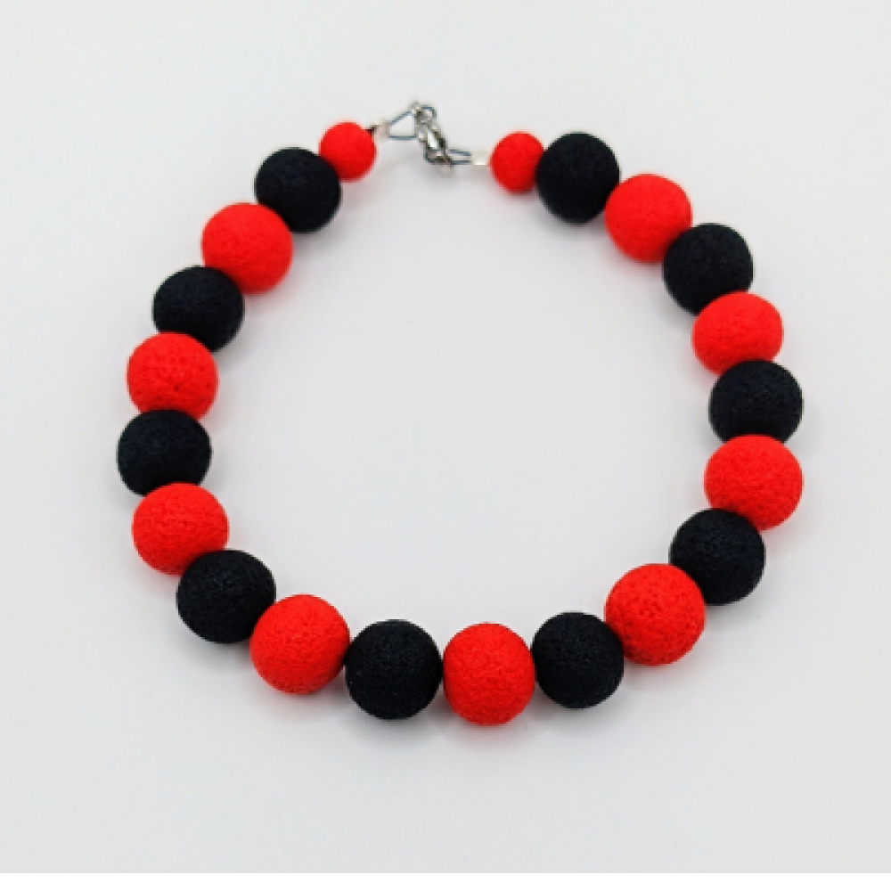 : Αυτό το βραχιόλι Statement ξεχωρίζει για τον κλασικό, δραματικό συνδυασμό χρωμάτων (Color Block), ιδανικό για να προσθέσει ένταση και στυλ σε κάθε εμφάνιση. Αποτελείται από στρογγυλές, μεγάλες χάντρες, οι οποίες έχουν ματ και σαγρέ υφή και είναι κατασκευασμένες από πολυμερή πηλό, χαρίζοντας μια αίσθηση βελούδου ή λάβας. Οι χάντρες εναλλάσσονται αρμονικά σε φωτεινό κόκκινο και βαθύ μαύρο. Η διάταξη των χαντρών δημιουργεί μια έντονη οπτική αντίθεση, τονίζοντας το κόσμημα ως κεντρικό κομμάτι. Το βραχιόλι δένει με ένα κούμπωμα σε ασημί χρώμα. Χρώμα: Κόκκινο, Μαύρο (Διχρωμία) Σχήμα: Στρογγυλές Χάντρες Υλικό: Χάντρες / Πολυμερής Πηλός Κούμπωμα: Ασημί Στυλ: Statement / Color Block / Pop