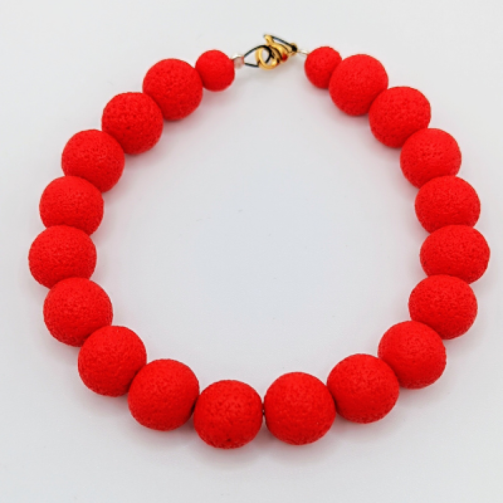 Αυτό το μονόχρωμο βραχιόλι Statement ξεχωρίζει για την μονοχρωματική ένταση του φωτεινού κόκκινου χρώματος, ιδανικό για να προσθέσει μια Pop πινελιά ή να λειτουργήσει ως ένα δυναμικό κομμάτι στο στυλ σας. Αποτελείται από μεγάλες, στρογγυλές χάντρες, οι οποίες έχουν ματ και σαγρέ υφή (που θυμίζει φλις ή λάβα) και είναι κατασκευασμένες από πολυμερή πηλό , επιβεβαιώνοντας την υφή που αναφέρατε. Όλες οι χάντρες είναι σε ένα έντονο, φωτεινό κόκκινο, ενώ ενδιάμεσα υπάρχουν πολύ μικρές χάντρες-διαχωριστές, επίσης κόκκινες. Το βραχιόλι δένει με ένα μικρό κούμπωμα σε χρυσαφί τόνο, το οποίο τονίζει τη ζωντάνια του κόκκινου. Χρώμα: Φωτεινό Κόκκινο (Monochromatic) Σχήμα: Στρογγυλές Χάντρες Υλικό: Χάντρες / Πολυμερής Πηλός Κούμπωμα: Χρυσαφί Στυλ: Statement / Monochromatic / Pop