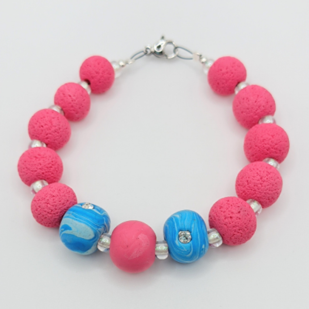 Αυτό το δυναμικό χειροποίητο βραχιόλι Statement ξεχωρίζει για τον παιχνιδιάρικο συνδυασμό χρωμάτων (Pop Art) και τις πολλαπλές υφές (Mixed Media), προσφέροντας μια φωτεινή και μοντέρνα αίσθηση. Η σύνθεσή του περιλαμβάνει μεγάλες, στρογγυλές χάντρες σε έντονο ροζ/φούξια με ανάγλυφη, ματ υφή (τύπου λάβας ή φλις) που εναλλάσσονται με μεγαλύτερες χάντρες στο κέντρο σε γαλάζιο/μπλε και ροζ, οι οποίες φέρουν μαρμαρέ/σβηστό μοτίβο και είναι διακοσμημένες με διακριτικά στρας/Swarovski για επιπλέον λάμψη. Επιπλέον, πολύ μικρές, διάφανες/περλέ χάντρες χρησιμοποιούνται ως διαχωριστικά, ενισχύοντας την αντίθεση του έντονου ροζ με το δροσερό γαλάζιο. Το βραχιόλι ολοκληρώνεται με ένα κούμπωμα σε ασημί τόνο. Υλικό: Χάντρες/ Πολυμερής Πηλός & Στρας/Swarovski Χρώμα: Ροζ Φούξια, Γαλάζιο/Μπλε, Περλέ, Διάφανο Σχήμα: Στρογγυλές & Μαρμαρέ Χάντρες Κούμπωμα: Ασημί Στυλ: Statement / Mixed Media / Pop / Colorful