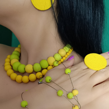 Εντυπωσιακό, μακρύ χειροποίητο κολιέ Statement με πολύχρωμες χάντρες σε αποχρώσεις Λαχανί και Κίτρινο/Πορτοκαλί. Όλες οι χάντρες έχουν ανάγλυφη υφή λάβας και είναι περασμένες σε ατσαλόσυρμα σε abstract design.